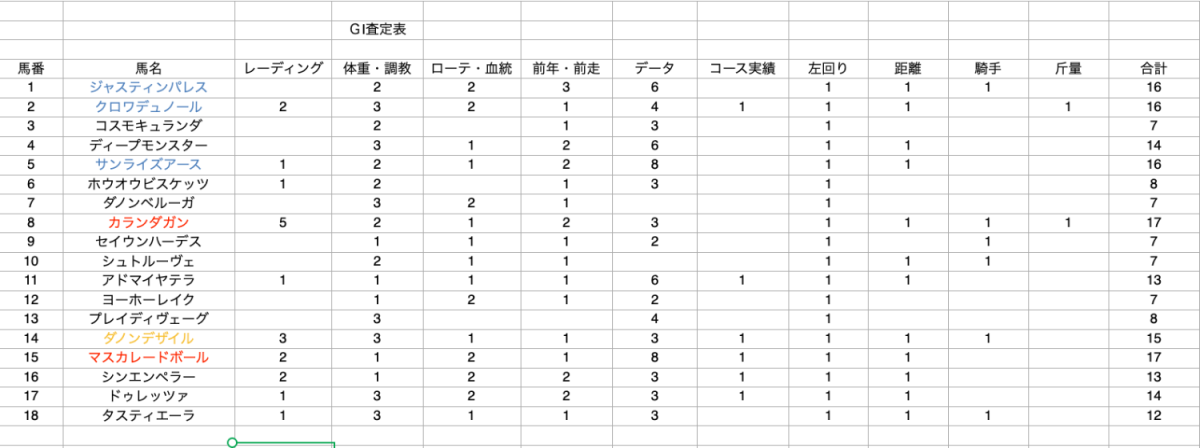 カランダガンの公式レーディングが130ポイントだ。(査定表のレーディングは筆者独自で算出しており別)公式レーディングで見るとマスカレードボールが121ポイントでクロワデュノールが120ポイントなので、中学生の運動会の中に高校生が1人(ダノンデザイル125ポイント)と大学生が1人(カランダガン)混じっているような構図になる。