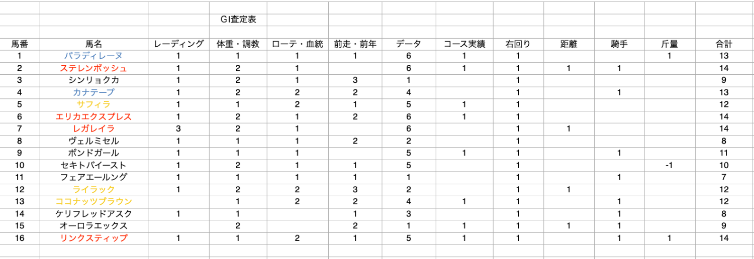 シンリョクカを狙いたい。前走の新潟記念は4着であったが、勝馬シランケドは天皇賞(秋)4着、2着馬エネルジコは菊花賞馬になり、3着馬ディープモンスターは京都大賞典を勝っていて4着馬がエリザベス女王杯を勝っても不思議ではないはずだ。またシンリョクカ自体も一昨年の当レースは9着(12番人気)、去年の当レースは4着(6番人気)とメンバーこそ毎年違えど走りの精度は上がっており今年は最大のチャンス到来、当馬がG1で激走するとすれば後にも先にも5歳充実期で迎えた今回のレースなのではないだろうか?偶然にも後に穴馬で取り上げるオーロラエックスとともにサトノダイヤモンド産駒で土曜日京都のレースで同産駒がどのような走り(順位)をするのかも確認しておきたい。
