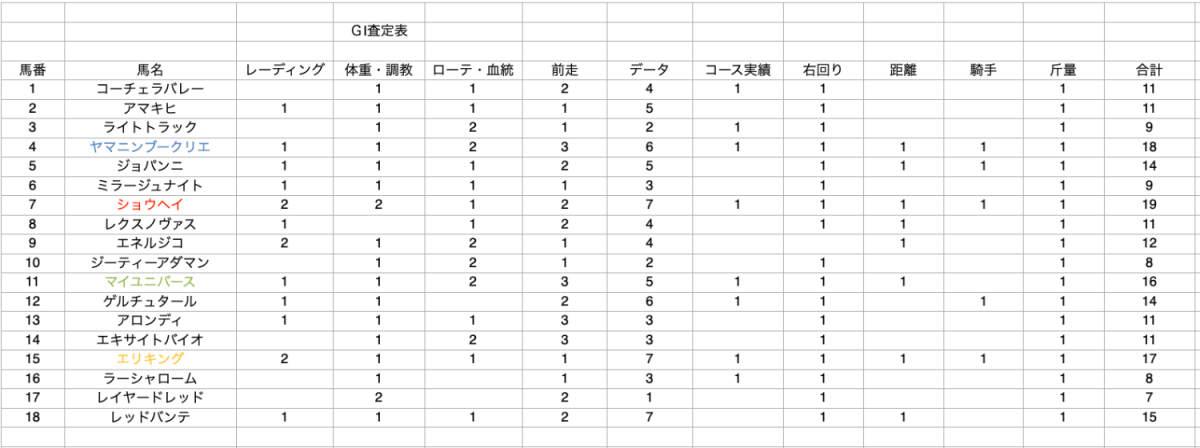 その他での3着内候補は天気や馬場状態もあって幅広く見る必要があって一長一短の馬がズラリ。ただ調教をみているとショウヘイ・ジョバンニ・エリキングは走りに柔らかさというか体全体を使う「ゆとり」と言うか、全体を大きく見せる姿があってクラシック戦線の準主役級らしさは感じられる。菊花賞メンバーにあってこの3頭は人間でいうといち早く少年から青年への階段を歩んでいるのかな?と思わせる。またレース当日の雨予報で不良馬場までいけば心配だが、メンバーを見渡せば鞘重や重馬場はこなして結果を出している馬が多いのが特徴だ。執筆しているのが金曜日なので(天気予報的に)流動的なところはあるが基本線でエレキング〜ミラージュナイトの2頭軸で勝負になるとみる。ただもう一頭は何が来てもおかしくなく、エレキングが想定1番人気ながらミラージュナイトは想定9番人気程度であり、もう一頭が人気処ならば例年並み、伏兵なら波乱となるイメージを持っている。