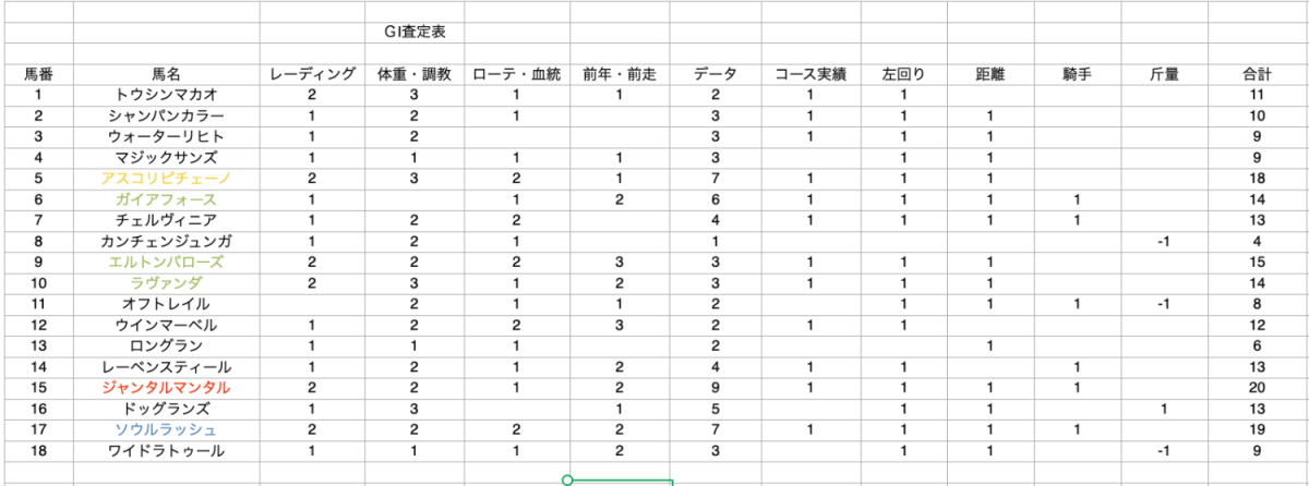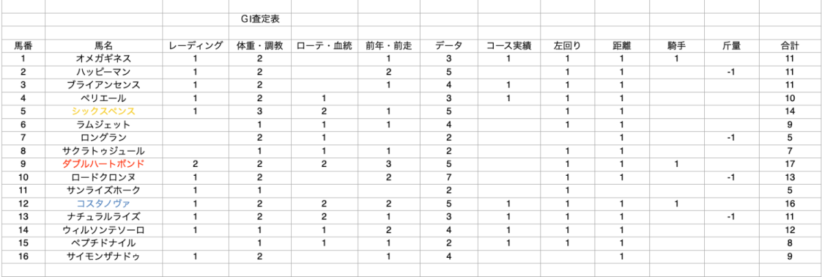 ※査定表は当日の馬場状態は考慮されておりません。